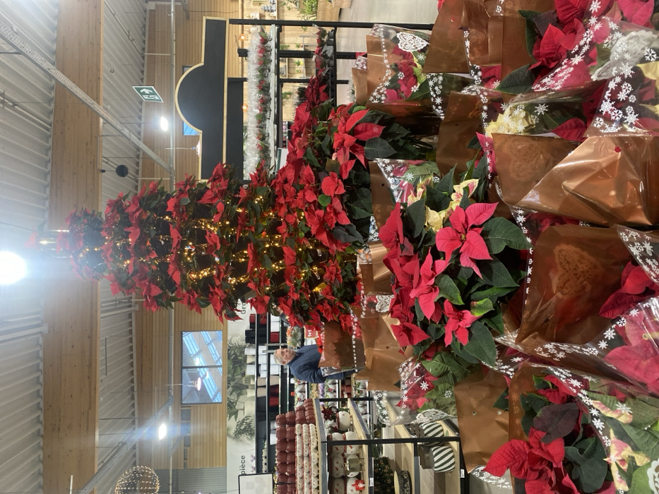 This image captures an indoor retail environment located in Mouscron, Belgium, characterized by extensive Christmas-themed floral displays