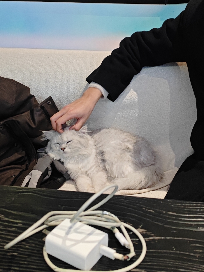 This image depicts an indoor scene within the Chongqing High-tech Zone, China. In the midground, a light-colored, fluffy cat with white and grey fur is resting comfortably on a light-beige upholstered sofa or bench, with its eyes closed in a relaxed state. A human left hand, with light skin tone and a white cuff visible beneath a black long-sleeved garment, is gently stroking the cat's head. To the left of the cat, a portion of a person's dark brown or black jacket is visible, also resting on the sofa. The background above the sofa features a smooth, horizontal panel with a gradient from light blue to light pink. In the foreground, on a dark, textured surface resembling a wooden tabletop, a white USB wall charger block is present, accompanied by a tangled white charging cable. The cable shows signs of wear or damage near one connector, with exposed internal wires.