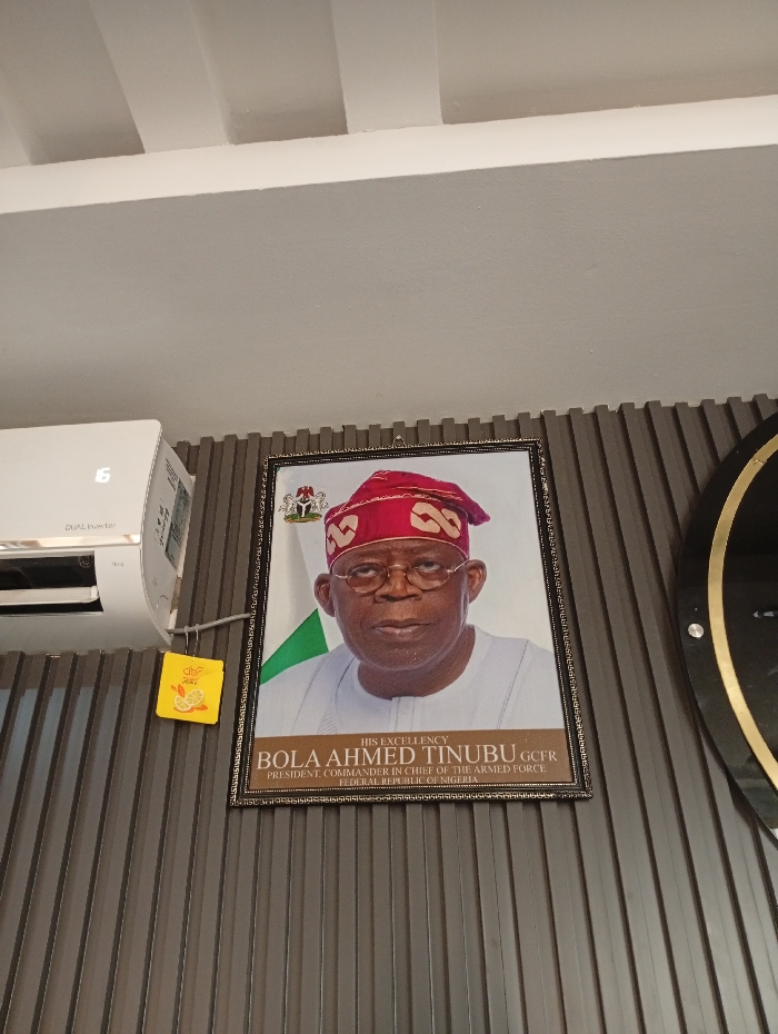 The image displays an interior scene, presumably within a government office or public building in Lokoja, Nigeria. A large, framed portrait of His Excellency Bola Ahmed Tinubu, GCFR, President and Commander in Chief of the Armed Forces of the Federal Republic of Nigeria, is centrally mounted on a dark grey, vertically fluted wall panel. The portrait depicts the president wearing a white agbada and a red traditional cap, with the Nigerian national flag and coat of arms visible in the background. To the left of the portrait, a white "DUAL Inverter" split air conditioning unit is affixed to the wall, displaying the number "16" on its digital interface. A small, yellow, square-shaped Lipton Lemon branded item hangs from a hook by a thin wire between the air conditioner and the portrait. A segment of a large, circular, black object with a gold rim is partially visible along the far right edge of the frame. The ceiling above is white and features prominent parallel structural beams. No individuals are present or engaged in any activity within the captured scene. The environment is formal and climate-controlled.