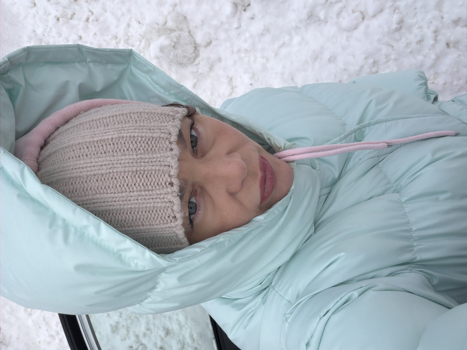 An adult individual, appearing female, is depicted in a close-up, upward-angled shot outdoors in Chernushka, Russia. The subject's face is centrally positioned, with blue-grey eyes staring directly at the camera and lips accented with pink lipstick. She is wearing a light aqua-colored puffer jacket with the hood pulled up, framing her face. Beneath the jacket's hood, a light beige ribbed knit beanie is visible, with a pink fabric layer partially visible underneath the beanie. Pink drawstrings extend from the collar area of the jacket. The background consists entirely of accumulated white snow, indicating a cold, winter environment. A dark object, consistent with a vehicle's door frame and window, is partially visible on the left side of the frame.