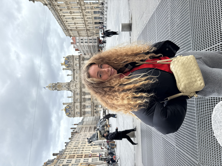 The image displays a woman smiling directly at the viewer, positioned slightly right of center in the foreground. She has long, voluminous, curly blonde hair and is dressed in a black puffer jacket over a red top, grey sweatpants, and a light beige woven leather cross-body bag. The immediate ground beneath her is a metal grate, which transitions into a large, light-colored paved public square. The setting is Place des Terreaux in Lyon, France. Dominating the background is the Hôtel de Ville de Lyon (City Hall), an ornate Baroque building featuring a central clock tower with a domed roof and four smaller golden-domed turrets. To the left of the Hôtel de Ville, a section of the Bartholdi Fountain, depicting sculptural horses, is visible. Adjacent to the fountain, traditional multi-story buildings line a street, with outdoor cafe seating visible. To the right of the city hall, another large classical building stands. Several indistinct figures are visible walking across the square in the mid-ground and background, including one man in a black puffer jacket walking left to right. The sky is uniformly overcast and grey.
