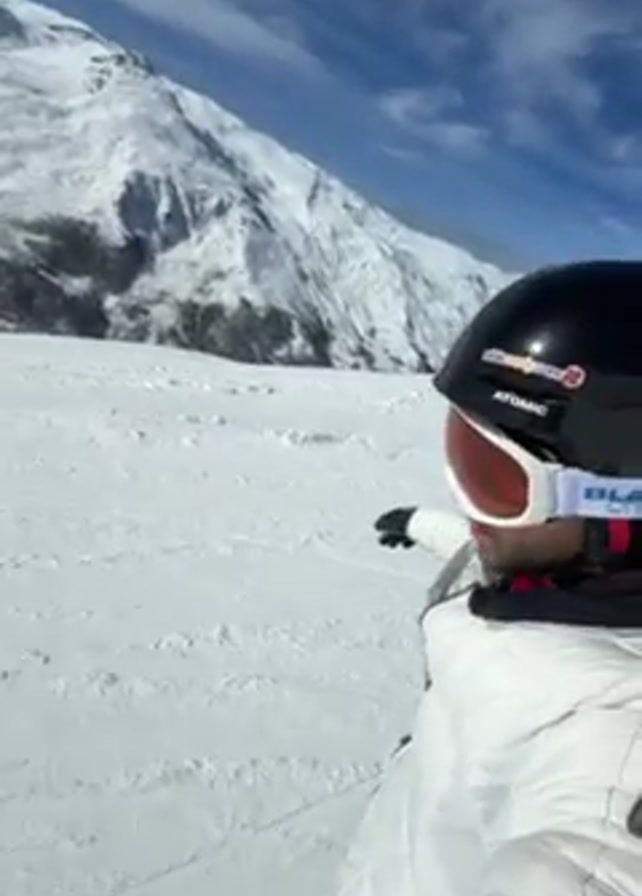 A snowboarder in a white jacket, black helmet, and orange-tinted goggles stands atop a snow-covered slope, the imposing, snow-capped peaks of a mountain rising in the background under a partly cloudy sky. The snowboarder gestures with their left hand towards the snowy terrain, revealing bright lime-green snowboard boots strapped to the board. The video appears to be shot from a first-person perspective, with the snowboarder as the focal point against the stark white landscape.