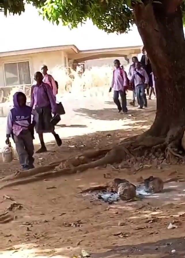 The scene appears to be outdoors, likely in a schoolyard, given the presence of children in school uniforms