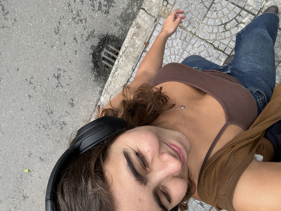 A young woman is capturing a selfie while outdoors. She's wearing dark jeans, a brown tank top with thin straps, and black over-ear headphones. She's standing on a concrete surface, part of which has a decorative circular pattern. Her eyes are closed, and she's smiling. A metal grate sits on the concrete beside her. A light brown jacket rests on her shoulders. She's wearing a delicate silver necklace with a round pendant.