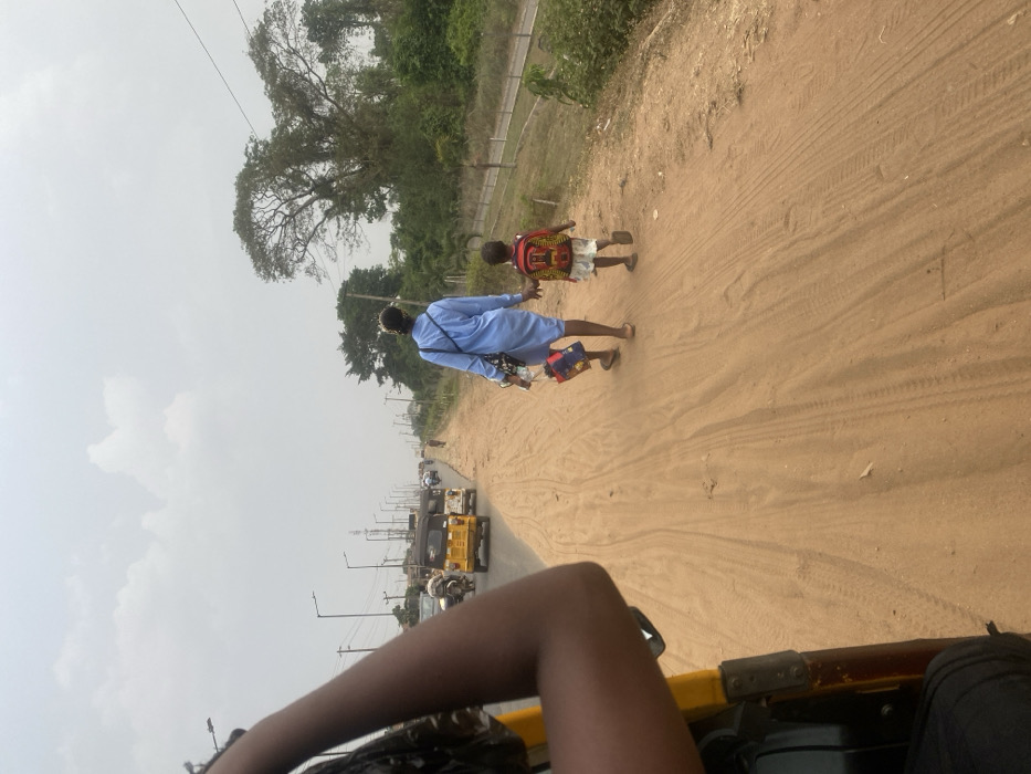 This image depicts a roadside scene in Moniya, Nigeria, under an overcast or hazy sky. The perspective is from inside a yellow vehicle, likely a tricycle taxi, with a partial view of a dark-skinned arm and the vehicle's yellow frame in the immediate left foreground. In the midground, an adult female and a small child walk away from the camera on an unpaved, reddish-brown sandy shoulder. The female, wearing a light blue, long-sleeved dress and brown flip-flops, holds the child's left hand with her right hand. She carries a blue and red bag containing a transparent bottle in her left hand. The child, dressed in a red, yellow, and black patterned shirt, white shorts, and dark footwear, wears a red backpack and holds the adult's hand. Tire tracks and footprints are visible on the sandy ground. To the left of the shoulder is a multi-lane paved road with visible vehicular traffic, including several yellow tricycle taxis and other automobiles, receding into the distance. Numerous dark streetlights line both sides of the road. In the background on the right, dense green foliage and several large trees, including one with prominent bare branches, are present. Distant structures are faintly visible on the left horizon, obscured by haze.