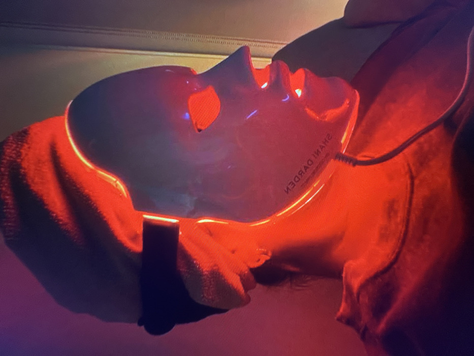 An individual is depicted indoors in Novoe Devyatkino, Russia, illuminated predominantly by red light emitted from a facial device. The subject, seen in profile, wears a white rigid LED facial mask, identified by the reverse text "SHANI DARDEN" on its lower left. The mask emits a strong red light, visible through its eye and mouth apertures and around its edges, casting a red hue across the scene. A thin black electrical cord extends from the bottom left of the mask. A light-colored towel, secured by a black band, is wrapped around the subject's head. The subject wears a dark-colored garment, visible at the neck and shoulders. The background is out of focus and dark, suggesting an indoor setting with minimal ambient light other than the mask's illumination.