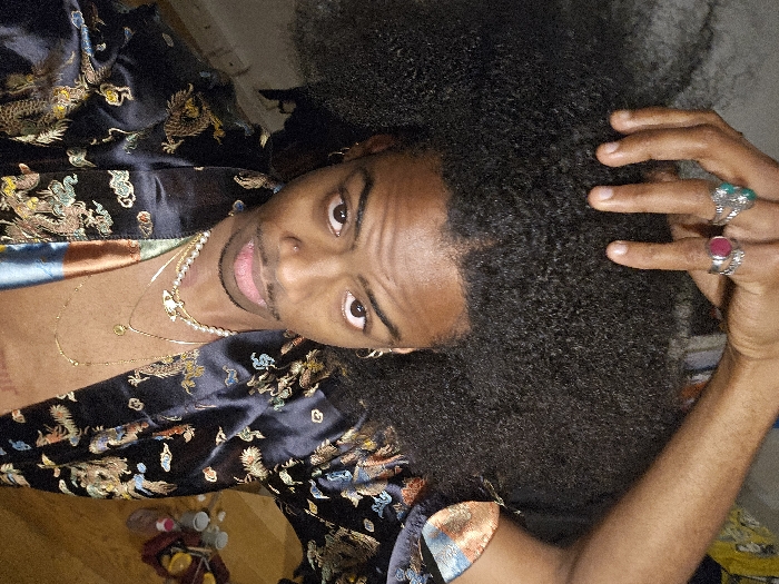 The image displays a close-up portrait of a dark-skinned individual, presenting as male, positioned in an indoor setting within the city of Pantin, France. The subject possesses voluminous dark curly hair. The right hand is raised above the head, with fingers splayed and resting on the top of the hair. This hand is adorned with a silver-toned ring featuring a turquoise-colored stone on the index finger, a plain silver band on the middle finger, and a silver-toned ring with a fuchsia-colored stone on the ring finger. The individual's face is directed towards the camera, exhibiting a small mustache and goatee. A silver nose ring is present on the left nostril, and small hoop earrings are worn in both ears. The subject is wearing an open, dark silk robe or jacket, intricately embroidered with gold, blue, and green patterns, primarily depicting dragons and clouds. Multiple necklaces are visible around the neck, including a strand of white pearls with a silver orb pendant, a delicate gold chain with a small round pendant, and an additional delicate gold chain. A wide, patterned bracelet or cuff, displaying shades of orange, copper, and blue, is visible on the left wrist. The background is intentionally blurred, revealing an indoor environment. To the right, a light-colored surface, possibly a wooden floor, holds several out-of-focus objects: multiple mugs or cups, a red woven basket containing citrus fruits, and a purple bottle.