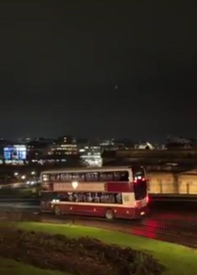 At night, a red and white double-decker bus moves along a road parallel to a landscaped hill in a city. The bus is well-lit with numerous passengers visible in the upper deck windows. In the background, city buildings are visible under a cloudy sky. Two red lights on a tall structure also punctuate the skyline. The camera briefly passes by a black metal fence.