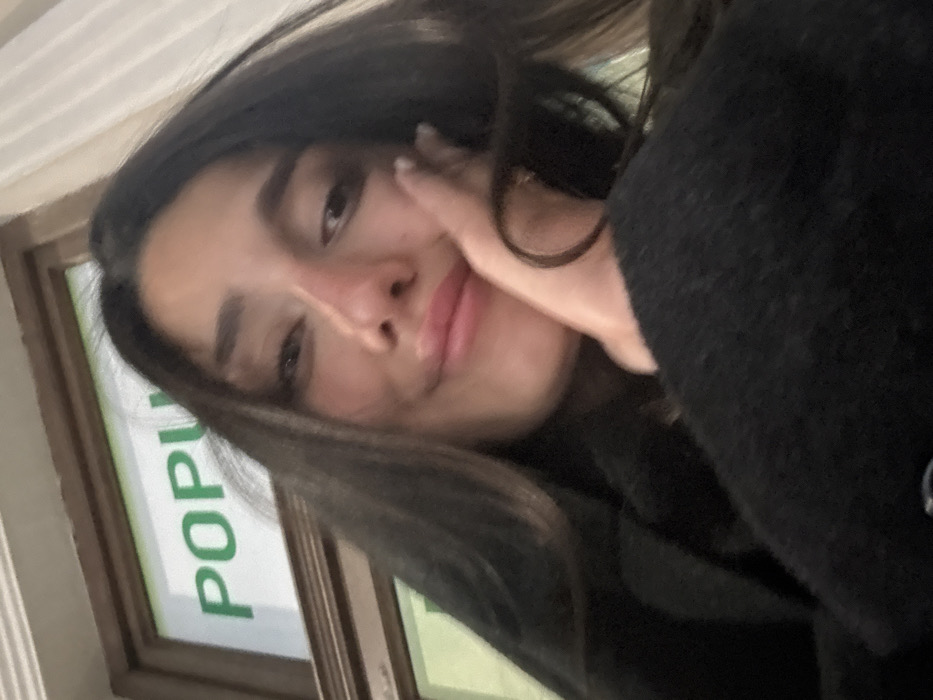 A young woman tilts her head, resting her cheek on her hand, with dark hair cascading around her face. She wears a dark, possibly black, sweater or coat. Behind her, a window displays the word "POPULAR" in green letters on a white background. The image has a slightly informal, selfie-like quality, suggesting it might have been taken casually.