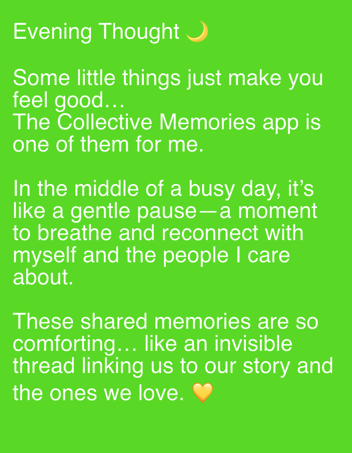 The image is a green-colored background with white text, resembling a social media post or a note. The text reads "Evening Thought," accompanied by a crescent moon emoji. Below this are reflections about appreciating small things, mentioning "The Collective Memories app" as a source of positivity. The text also touches on the idea of taking a break during a busy day to reconnect with oneself and loved ones through shared memories. The post ends with the sentiment that shared memories provide comfort and link us to our stories and those we love, represented by a yellow heart emoji. The image does not show any specific location in Chambœuf, France.