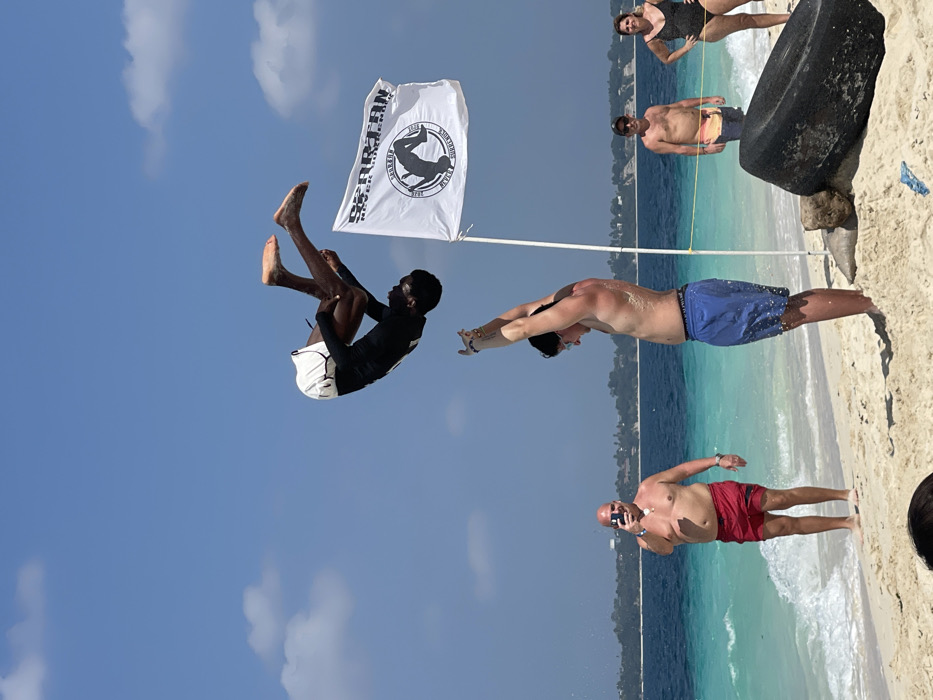A daytime scene depicts an acrobatic performance on a white sandy beach in Zanzibar, Tanzania