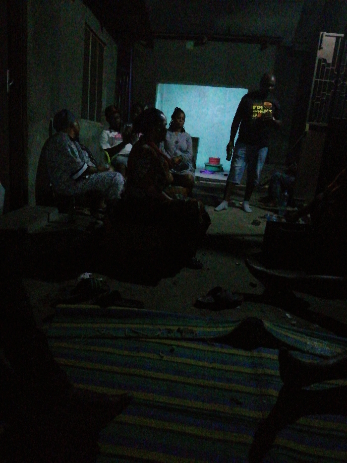 A group of people are gathered in a dimly lit room. Some are seated on chairs or the floor, while one man stands. He wears a dark shirt and light-colored shorts, seemingly addressing the group. The room has a casual, lived-in feel, with a rug on the floor and various items scattered around. A bright screen or window is visible in the background, providing the only significant light source. The overall atmosphere appears relaxed and informal.