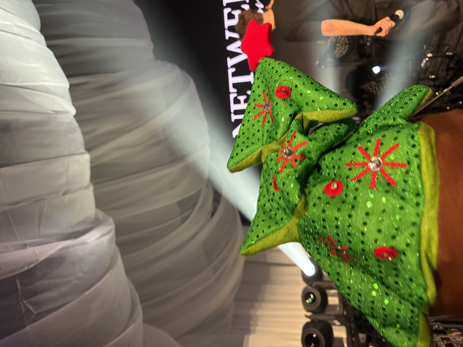 Three green Christmas tree hats stacked atop one another. Each is adorned with red and silver starbursts and dots, and topped with a red star. A tiered white fabric sculpture stands to the left. In the background, a person holds a microphone, bathed in stage lighting. Camera equipment is visible at the bottom. The hats are sparkling and festive.
