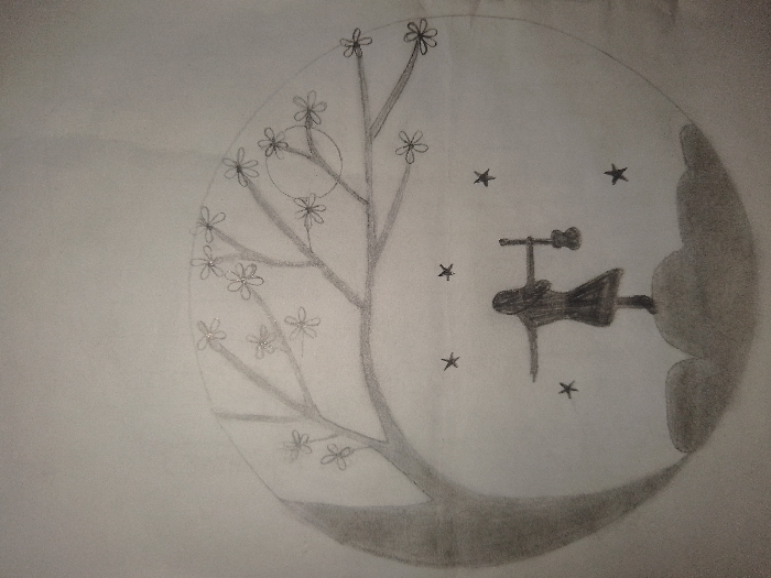 This image is a monochrome pencil drawing on white paper, depicting a stylized outdoor scene within a circular frame. A lone female figure, viewed from the back, stands centrally on a shaded, rounded mound, which serves as foreground terrain. Her long hair extends down her back. Her left arm is outstretched horizontally to her side. Her right hand holds a small, dark stringed instrument, consistent with a ukulele or small guitar, vertically by its neck. She wears a dark, knee-length dress. The background features a large, dark tree with a thick trunk and extensive branches reaching across the upper portion of the frame. Numerous small, simple flowers with outlined petals adorn these branches; some of these outlines exhibit a glistening quality. A crescent moon is visible among the branches. Scattered across the sky area are multiple five-pointed stars. The shading suggests a night or twilight setting. The scene is an artistic rendition and does not represent a specific real-world location in the city of Unknown, Unknown.