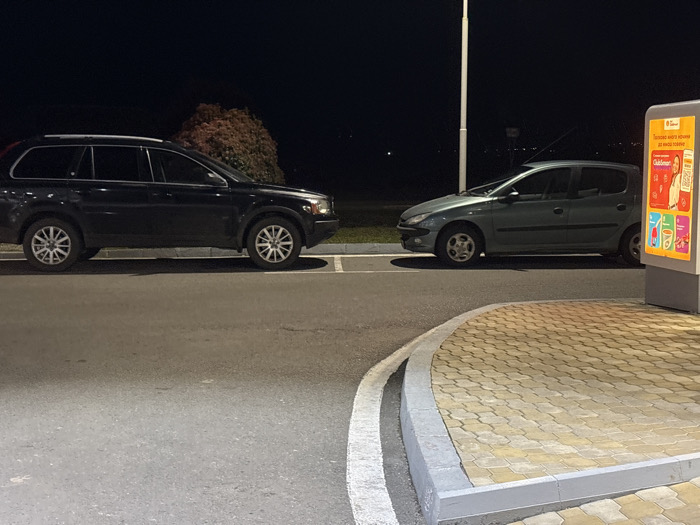 The image presents an outdoor night scene in Pomorie, Bulgaria, featuring a paved area with two parked vehicles and an illuminated advertising display. On the left side, a black first-generation Volvo XC90 SUV is stationary, oriented facing right. On the right side, a light green (or teal) Peugeot 206 hatchback is stationary, oriented facing left, positioned adjacent to a tall, rectangular advertising display. This display is illuminated, showcasing colorful product advertisements and text written in Cyrillic characters. The ground surface consists of dark asphalt in the immediate foreground and midground, leading to a raised section on the far right composed of interlocking pavers in beige and grey, forming a sidewalk or platform. A grey concrete curb separates the asphalt from the paved area. White painted lines are visible on the asphalt, delineating parking or road edges, and along the top edge of the curb. A tall, light-colored streetlamp pole stands in the background between the two vehicles. Behind the Volvo, a dark, dense shrub or tree is visible. The sky is dark, indicative of nighttime, with faint distant lights visible on the horizon. No individuals are present within the scene.