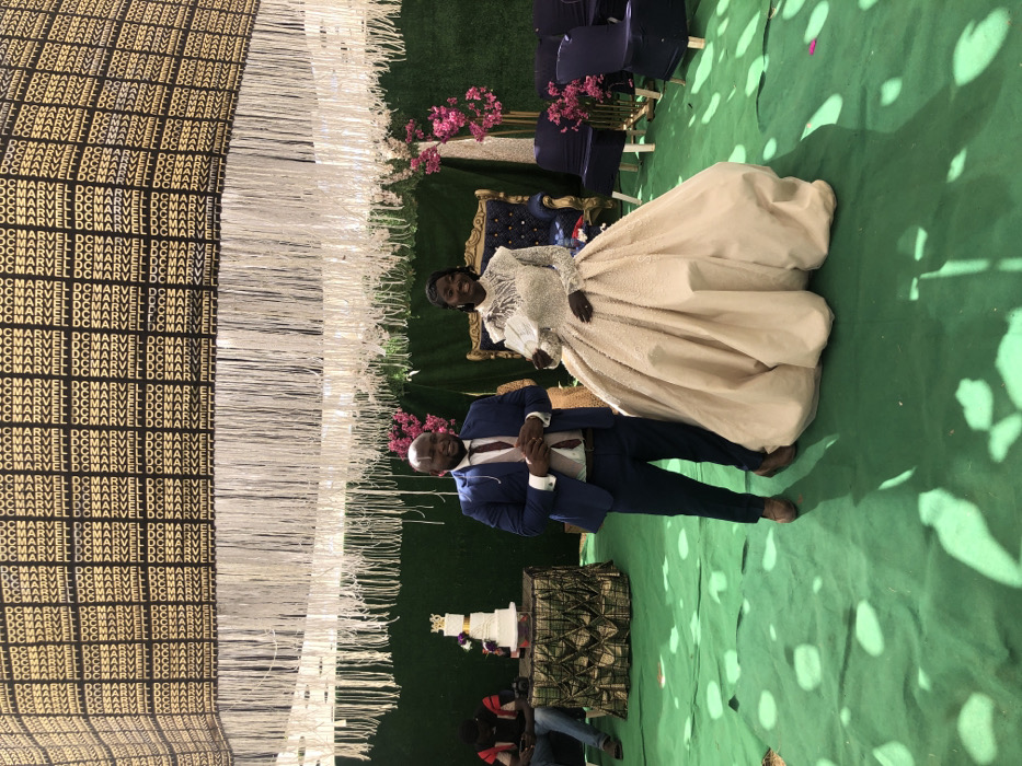 The image depicts an indoor or covered event space, identified as being in Kerang, Nigeria. Two individuals, a male and a female, stand centrally, facing the camera and smiling. The male, positioned on the left, is dark-skinned, bearded, and wears a dark blue suit, light-colored shirt, dark tie, and brown shoes. A small, dark earpiece is visible in his right ear. His hands are clasped at waist level. The female, positioned to the right and slightly behind the male, is dark-skinned and wears a long-sleeved, high-necked, champagne-colored ball gown with beaded detailing. She holds a white fan in her left hand. To the left in the background, a three-tiered white wedding cake adorned with purple floral accents and a gold crown topper rests on a round table draped with a gold and dark green patterned cloth. Further to the left, a partially visible male subject is seated, wearing a red, black, and white striped shirt and blue jeans, appearing to be using a mobile phone. Behind the primary female subject, an ornate blue armchair with gold trim is visible, alongside several dark blue fabric-covered chairs. Pink floral arrangements on stands and green foliage backdrop elements are situated behind the main subjects. The floor is covered with a light green carpet or mat, exhibiting bright reflections. Overhead, a black and gold geometric-patterned fabric canopy is suspended, bordered by multiple layers of white fringe. The background wall is draped with a solid dark green fabric.
