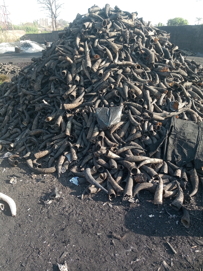 A large pile of animal horns dominates the image, densely packed and dark in color. The horns vary in size and curvature, with open ends visible throughout the heap. A black plastic bag and a dark tarp are partially embedded within the pile. The ground surrounding the horns is covered in dark debris, possibly ash or dirt. Trees and industrial structures are visible in the background, suggesting an outdoor storage or disposal site.
