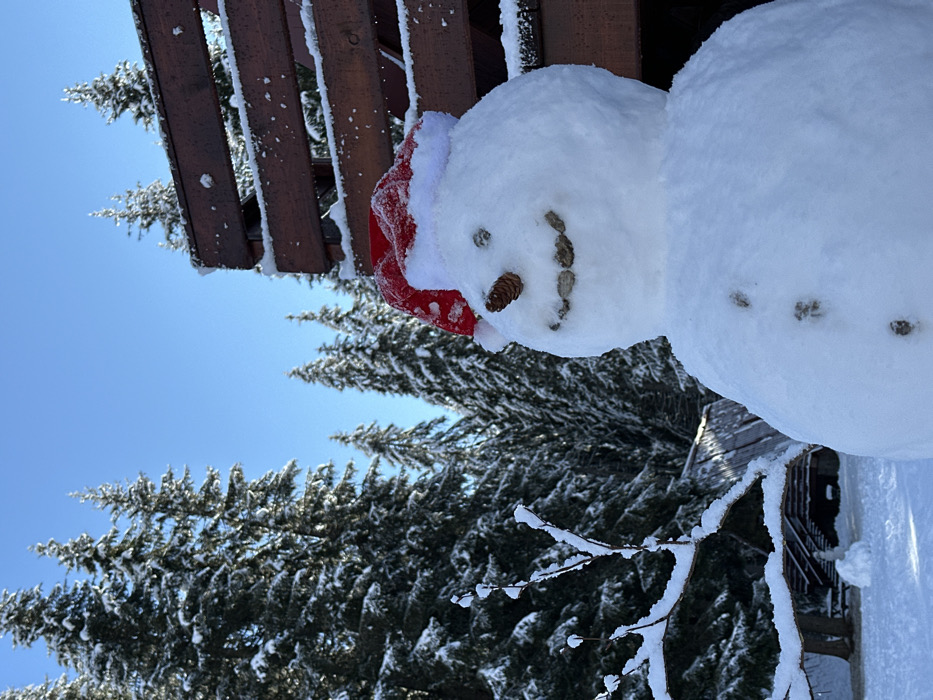 The image depicts a snow-covered winter scene in Stoikite, Bulgaria, under a clear blue sky. In the foreground, a multi-tiered snowman is prominently featured. It wears a red Santa hat with a white trim and pom-pom. Its facial features consist of two small dark objects for eyes, a single pinecone for a nose, and several small, dark, oblong objects forming a curved smile for a mouth. Three similar small, dark objects are arranged vertically down its body, resembling buttons. To the immediate right of the snowman, a section of a dark brown wooden railing or fence, partially covered in snow, is visible. To the left, a snow-dusted, leafless branch extends into the frame. The background is dominated by a dense forest of tall, snow-laden evergreen trees under a bright blue sky. In the far left-midground, a small, dark wooden building with a snow-covered, pointed roof is partially visible, and a smaller, partially formed or melted snowman stands nearby. The ground is uniformly covered in white snow.