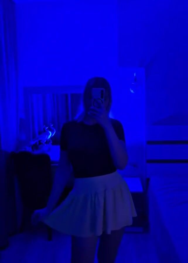 A woman stands in a room illuminated by blue light, taking a selfie in a mirror. She is wearing a dark short-sleeved shirt and a light-colored, short, pleated skirt. Her blonde hair falls to her shoulders. In the background, there is a bed, a desk with a mirror, and a chair. The room appears to be a bedroom. She is holding her phone in front of her face.