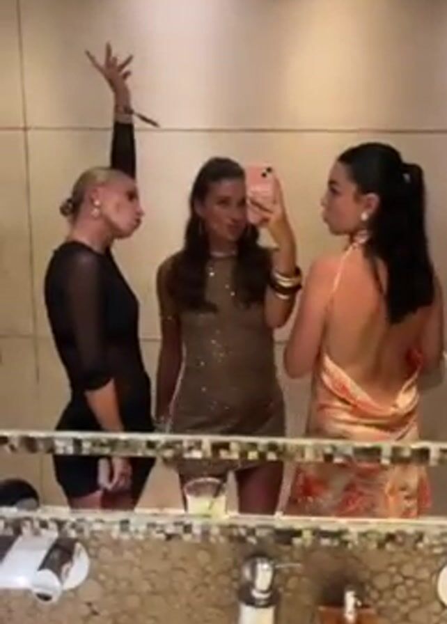 Three women are posing for a selfie in a bathroom mirror. The woman on the left wears a black, semi-sheer long-sleeved top and a black skirt. Her blonde hair is pulled back. The woman in the center wears a gold sequined dress. The woman on the right wears a patterned orange and cream dress with a low back. Her dark hair is pulled back. All three women are posing with pursed lips. The woman in the center holds up a phone to take the selfie. There are toiletries and a drink on the counter in front of the mirror. The countertop is covered in small stones or tiles. The walls are light beige.