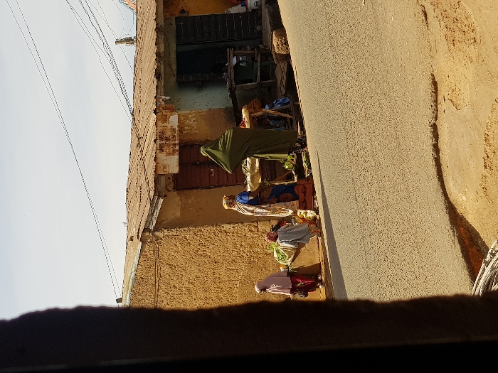 This image depicts a street scene in Jos, Nigeria, featuring an informal market adjacent to a building under a clear, bright sky. The central structure is a single-story building with textured, light brown walls and a weathered corrugated metal roof. A partially legible, faded white sign with red lettering reading "HAMIS HAREL STORE" is visible above a dark doorway on the building's facade. Multiple black utility wires crisscross against the sky above the building. The foreground and mid-ground consist of an uneven asphalt road surface, with a dirt shoulder to the right exhibiting minor erosion. A dark, out-of-focus element frames the left side of the image. Four individuals are present near the building: 1. On the far left, a person, likely female, stands wearing a light pink head covering and a long pink garment, holding a dark bag. 2. Adjacent to this person, a child in a light blue outfit and a red head covering stands near bundles of green produce. 3. Towards the center, an adult, likely female, wears a patterned blue, brown, and orange garment with a light head covering, standing by a market stall displaying green produce. 4. On the right, an adult is fully enveloped in a dark olive green veil, facing away from the viewer, positioned near another market display or collection of goods. The individuals appear to be engaged in typical market activities, either as vendors or patrons, along the roadside.