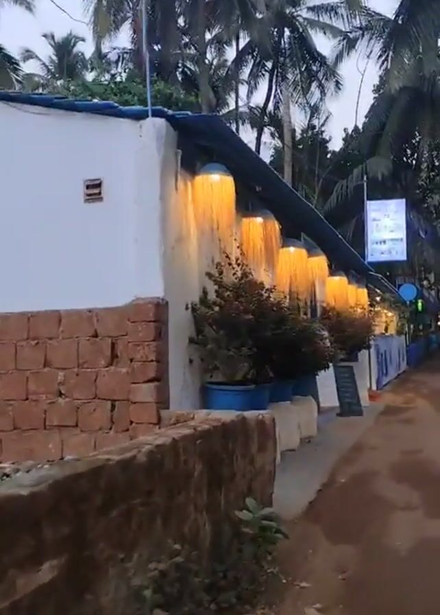 A street view showcases the facade of a restaurant, likely at dusk or dawn. The building features a white wall with a brick base, adorned with hanging lights that emit a warm glow. Potted plants with colorful blooms are placed along the base of the wall. Palm trees sway in the background. The restaurant entrance is accented with a blue trim, and a sign is visible near the entrance. The path leading to the restaurant is partially paved. There are some people visible in the distance walking past the restaurant.
