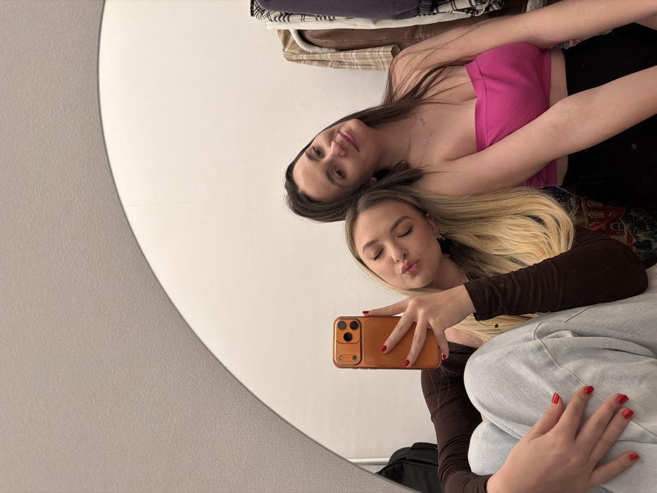 Two young women pose for a selfie in a round mirror. One has long, dark hair and wears a pink tube top. The other has blonde hair and is dressed in a brown long-sleeved shirt. She is holding a phone with an orange case and blowing a kiss. Her nails are painted red. A pile of clothing can be seen at the top of the mirror.