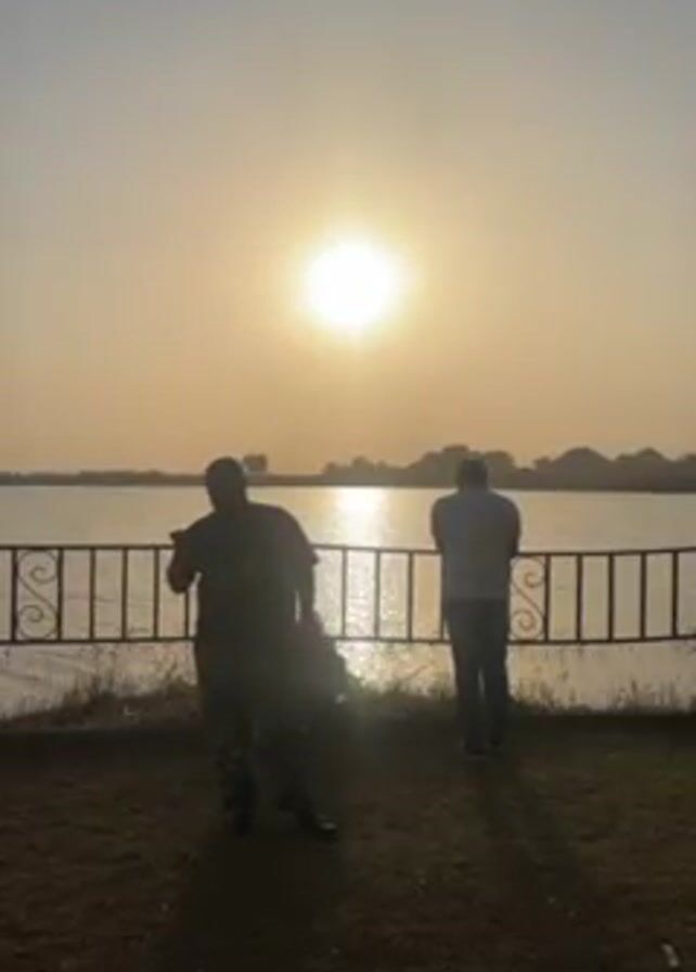 Two men stand by a railing overlooking a body of water at sunset. The man on the left is wearing a dark t-shirt and camouflage pants, while the man on the right is wearing a light-colored shirt and dark pants. The sun is setting over the water, creating a bright glare and silhouetting the men. The railing is made of dark metal with decorative swirls. The ground is covered in short grass.