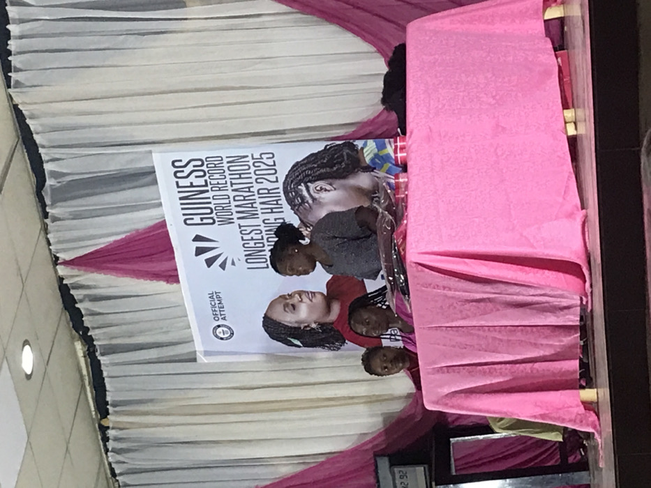 A sign for "Guinness World Record Longest Marathon Braiding Hair 2025" is displayed in front of pink and white draped fabric