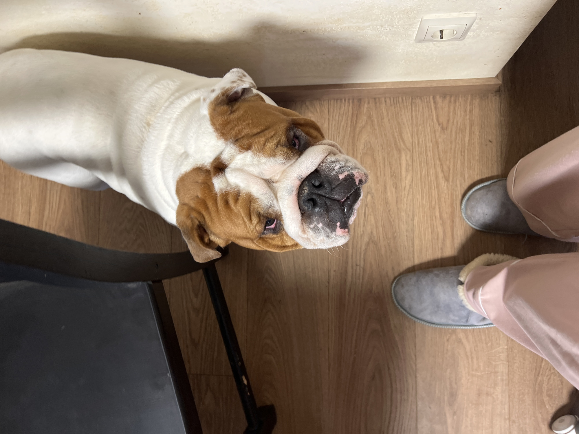 A medium, eye-level shot shows a white and brown bulldog looking up at the camera. The dog is lying on a light brown hardwood floor next to a black chair and a person's feet. The person is wearing pink pajama pants and gray slippers. A white electrical outlet is visible on the wall. The location is likely indoors, based on the presence of the chair, wall, and electrical outlet. There is no information to support the presence of Gelendzhik, Russia.