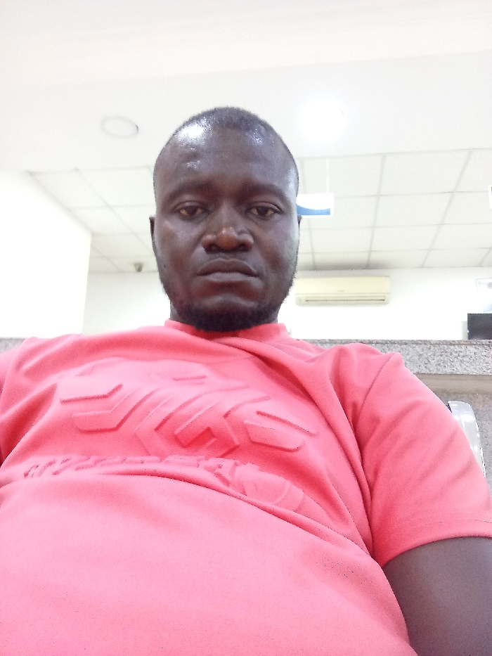 The image depicts a single adult male, positioned centrally and facing directly towards the camera. He has dark skin, short dark hair, and a short beard. He is wearing a short-sleeved, coral-colored shirt with a raised, geometric pattern on the chest. The scene is indoors, within a commercial or institutional building, located in the city of Hotoro South, Nigeria. The background features a white suspended ceiling with visible grid lines and circular recessed light fixtures. White walls are visible, along with a light-colored, wall-mounted air conditioning unit on the right side. Below the air conditioner, a speckled grey counter or ledge extends, with a dark, indistinct object partially visible on its surface to the far right. A blue, rectangular element, possibly signage, is suspended from the ceiling in the mid-ground. The lighting is bright and even.