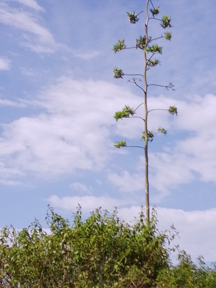 A tall, slender plant with a long, bare stalk rises above a dense green bush. The stalk is punctuated with sparse, leafy protrusions resembling small bouquets at intervals up to its apex. The backdrop is a bright, slightly overcast blue sky with scattered white clouds. The scene is bathed in natural light, suggesting a clear day.