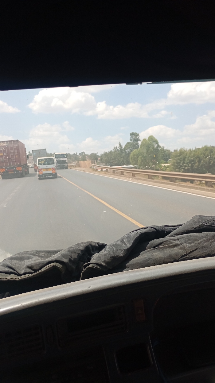 View from inside a vehicle traveling on a highway. Other vehicles, including a van and trucks, are ahead on the multi-lane road. A yellow line divides the lanes. A bridge with railings is visible to the side, along with trees and some buildings in the background. The sky is cloudy. The dashboard and what appears to be a dark-colored cloth cover are visible in the foreground.