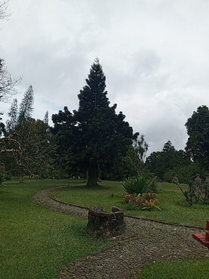 The image depicts a manicured garden or park scene, characteristic of the Bà Nà Hills complex in Đà Nẵng, Vietnam. The sky is overcast with a uniform layer of grey and white clouds, providing diffused lighting. A winding, dark grey cobbled stone pathway extends from the foreground, curving towards the middle ground, where it disappears behind a large tree. The ground is covered in lush, well-maintained green grass. In the mid-ground, a prominent, tall, dark green coniferous tree stands centrally, with its dense foliage reaching towards the sky. Various other trees and shrubs are scattered throughout the scene, forming a natural backdrop. To the left, a deciduous tree with sparser, gnarled branches is visible. On the right, groups of smaller, broad-leafed plants, some exhibiting reddish-brown coloration, are interspersed within the grass. In the foreground, to the right of the path, a low, circular stone structure, possibly a weathered wellhead or planter, is visible. It appears dark grey-brown and is partially covered with moss and lichen. A fragment of a reddish-brown, possibly wooden or tiled, structure is visible in the extreme bottom right corner. No individuals or animals are present, and no actions or interactions are depicted within the static scene.
