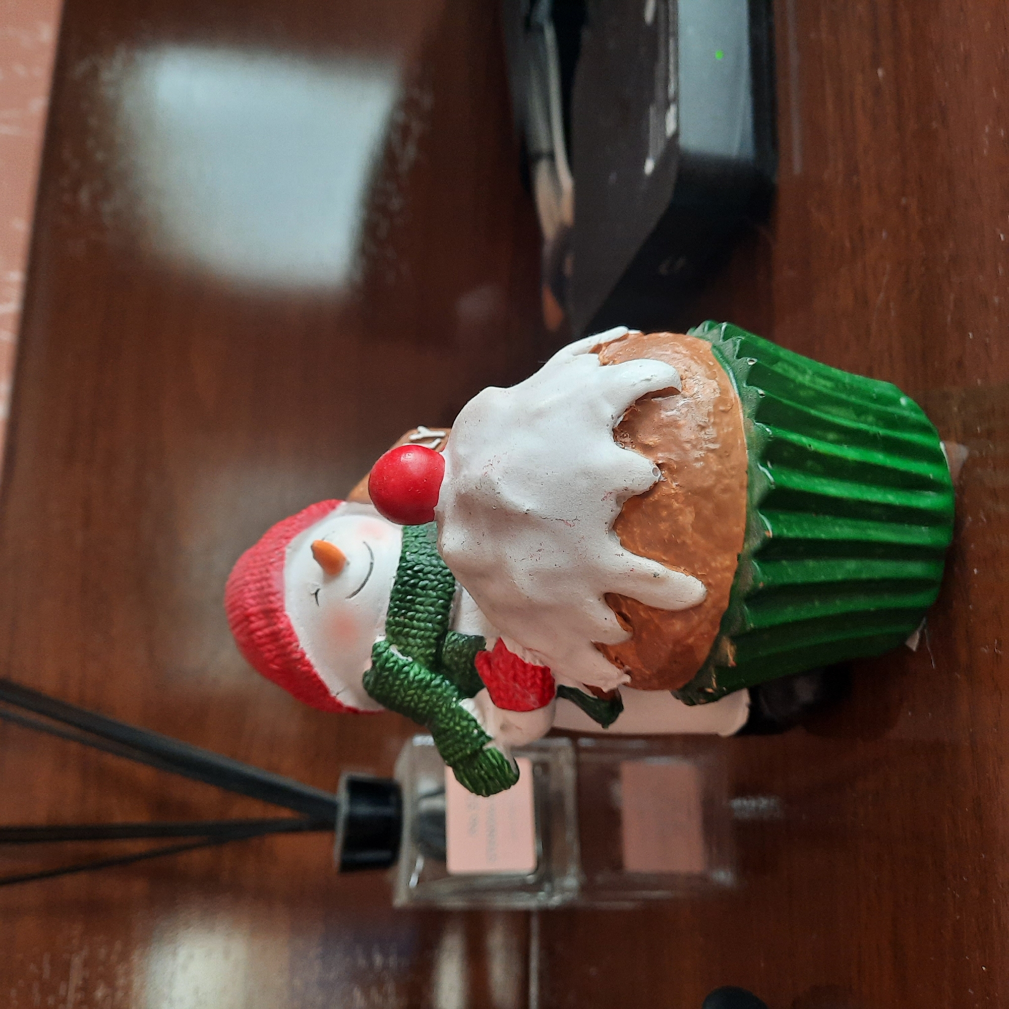 The image displays a close-up of a static decorative arrangement situated on a dark brown wooden surface, presumed to be within a private residence in Kurganinsk, Russia. The primary subject is a ceramic figurine depicting a snowman holding or positioned directly behind a large cupcake. The snowman figurine features a white body, a red knitted-texture cap, a prominent orange carrot-shaped nose, two small black dots representing eyes, and an upward-curved line indicating a smile. It wears a green knitted-texture scarf wrapped around its neck and red knitted-texture mittens. The snowman's body is partially obscured by the cupcake. The cupcake figurine, held by or placed in front of the snowman, consists of a round, brown, cake-like base with textured white frosting cascading over the top and sides. A single red, spherical object, resembling a cherry, is positioned centrally on the frosting. The cupcake is encased in a distinct green, vertically fluted wrapper. To the immediate left of the snowman-cupcake assembly, a transparent glass bottle with a black cap and several black diffuser reeds is present. A light-colored label on the bottle is visible but its text is illegible. To the right, a dark, rectangular electronic device, possibly a router or similar peripheral, is partially visible, displaying a small, illuminated green indicator light. The wooden surface beneath the objects exhibits some minor white specks, consistent with dust particles. The background is out of focus, showing a warm, reddish-brown hue consistent with a wall or furniture surface.