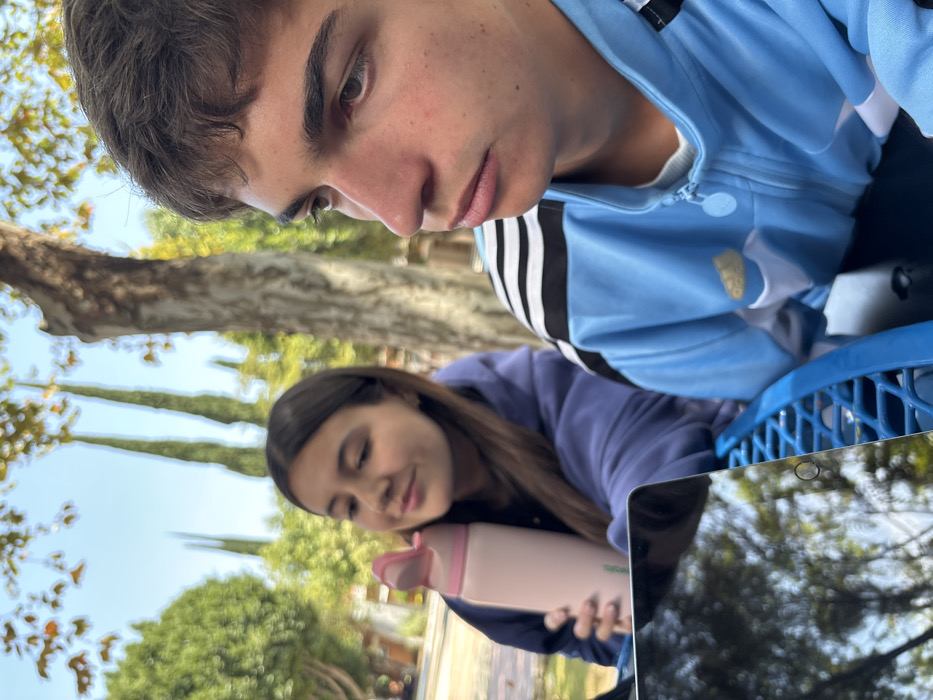 The image captures two individuals seated outdoors during daytime. In the foreground, positioned to the right, a male with short dark hair and fair skin is seen in profile, looking towards the right with a neutral expression. He wears a light blue Adidas track jacket featuring white and black stripes on the shoulders and a golden Adidas logo on his left chest. To the left and slightly behind him, blurred in the background, a female with long dark hair and fair skin is visible, smiling faintly and looking to her right. She wears a dark blue or purple hooded sweatshirt and holds a light pink insulated water bottle with a darker pink flip-top lid. A black electronic device, appearing to be a tablet or laptop screen, is partially visible in the bottom left corner, resting on a blue metallic mesh surface and reflecting the sky and trees. The outdoor environment includes various trees, notably tall, slender, conical trees and rounded green foliage, under a bright sky. The specific location within the city of Puebla, Mexico, is not identifiable from the visual information presented.