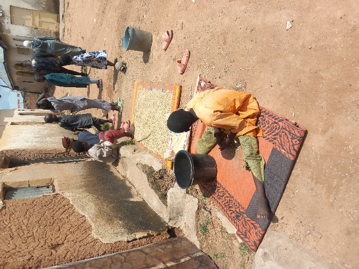 The image depicts an unpaved street scene in Zangon Aya, Nigeria, under daylight. On the left, a weathered building with a mud-plastered facade and concrete base features a window with louvered shutters. In the foreground, an individual wearing an orange long-sleeved garment and green lower wraps sits on a black and orange patterned mat, facing away from the camera, engaged in handling light-colored grains. A black bucket rests beside them on the mat. To their right, a larger patterned mat is spread on the dirt ground, covered with a significant quantity of light-colored, granular material. A gray bucket and two pink slippers are situated near this mat. Along the base of the building on the left, a child in a light-colored top and red pants sits on a concrete ledge. In the midground, a group of five children are present: one in a white and blue patterned dress, another in a light-colored outfit with hands raised to their head, and three others standing. Further down the street in the background, two adults are visible; one male in a dark patterned shirt and one female in a light-colored abaya.