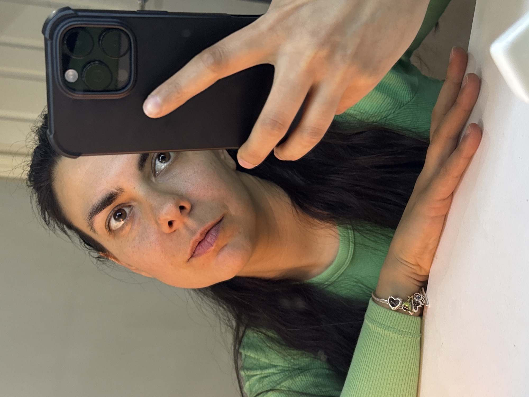 The image captures a selfie being taken by an adult individual with dark hair, visible from the upper chest. The person is wearing a light green, long-sleeved top and has a silver charm bracelet on their left wrist, featuring multiple distinct charms including a black heart and other metallic designs. The individual holds a dark-colored smartphone, equipped with a prominent triple-lens camera module, in their right hand, partially obscuring the right side of their face. Their left arm rests on a white, flat surface in the foreground. The person's gaze is directed upward and slightly to the right, with their eyes wide open, and their lips display a neutral to slight pout. The background consists of a plain, light-colored wall, possibly featuring subtle vertical paneling. The scene is illuminated by a warm light source, casting an orange hue on the subject's skin. The specific indoor location within the city of Great Yarmouth, United Kingdom, is not identifiable from the visual content.