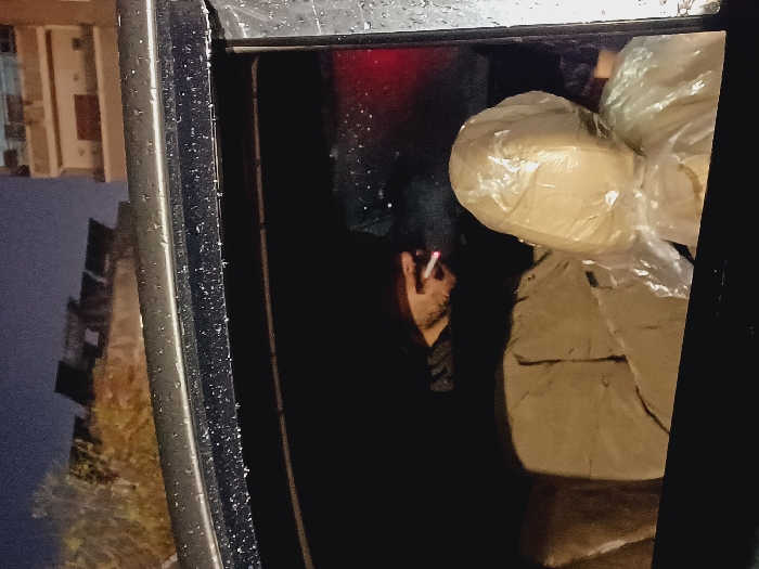Through a rain-streaked window, three bulky, amorphous objects wrapped in clear plastic are visible. A dark silhouette of a person smoking is partially visible to the left. The person appears to be in a vehicle with the objects. Outside the vehicle, a blurred building stands inverted in the reflection on the wet surface.