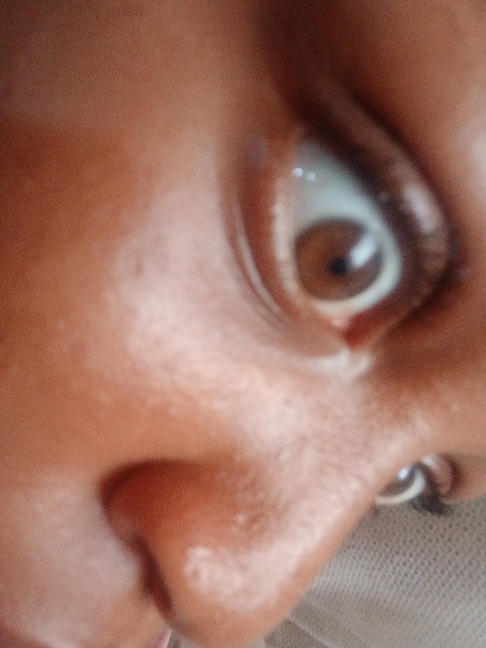 A close-up, slightly soft-focused image depicts a portion of a human face, oriented diagonally, with the right eye, nose, and part of the cheek and forehead prominently featured. The individual possesses dark brown skin. The right eye is open, revealing a brown iris, a dark pupil, and a visible, somewhat off-white sclera. Multiple light reflections are present on the cornea. The bridge and side of the nose are visible, exhibiting minor skin texture and small bumps. A faint, silver-toned, circular object, possibly an earring, is partially visible in the bottom right corner, suggesting the presence of an ear. The background is indistinct, showing a light, possibly textured surface in the lower right, otherwise blurred. The location in the city of Agani, Nigeria, cannot be determined from the visual content of this image.
