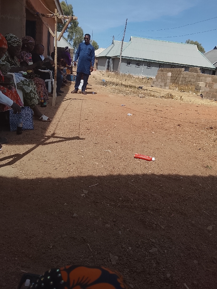 The scene depicts a sunny, outdoor gathering in Gwafan, Nigeria. In the foreground, an unpaved reddish-brown dirt ground with small stones and scattered litter, including a red plastic squeeze bottle and a red comb, leads into the midground. Distinct shadows fall across the foreground from an unseen structure to the left. To the left, under a rudimentary shaded overhang formed by poles and a roof structure, a group of approximately 6-8 individuals, primarily women, are seated on chairs. They are dressed in colorful patterned fabrics, many with head coverings. One person's leg with an orange and black floral pattern is visible in the extreme bottom foreground. A blue and white patterned bag and a clear plastic bottle rest near their feet. In the midground, a man stands centrally on the dirt path, facing slightly left. He wears a blue patterned traditional Nigerian attire and sandals, with his hands at his sides. He has a beard and dark hair. The background features additional buildings and dry vegetation under a clear blue sky with sparse clouds. To the right, partially obscured by a low wall of cinder blocks, stands a grey-walled building with multiple rectangular windows and a grey corrugated metal roof. Further back and to the left of this building, another structure with a similar grey corrugated roof is visible. Dry, light brown grass and weeds line the edges of the dirt path. Utility poles and distant trees are also present.