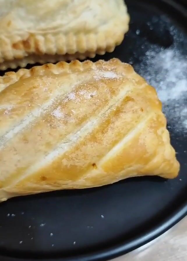 two pastries on a black plate dusted with white powder, possibly powdered sugar. The pastries are golden brown and appear to be freshly baked, with crimped edges. One is rectangular with diagonal slits, and the other is rounder. The plate sits on a light-colored wooden surface, and in the background, there are several blurry glass containers.