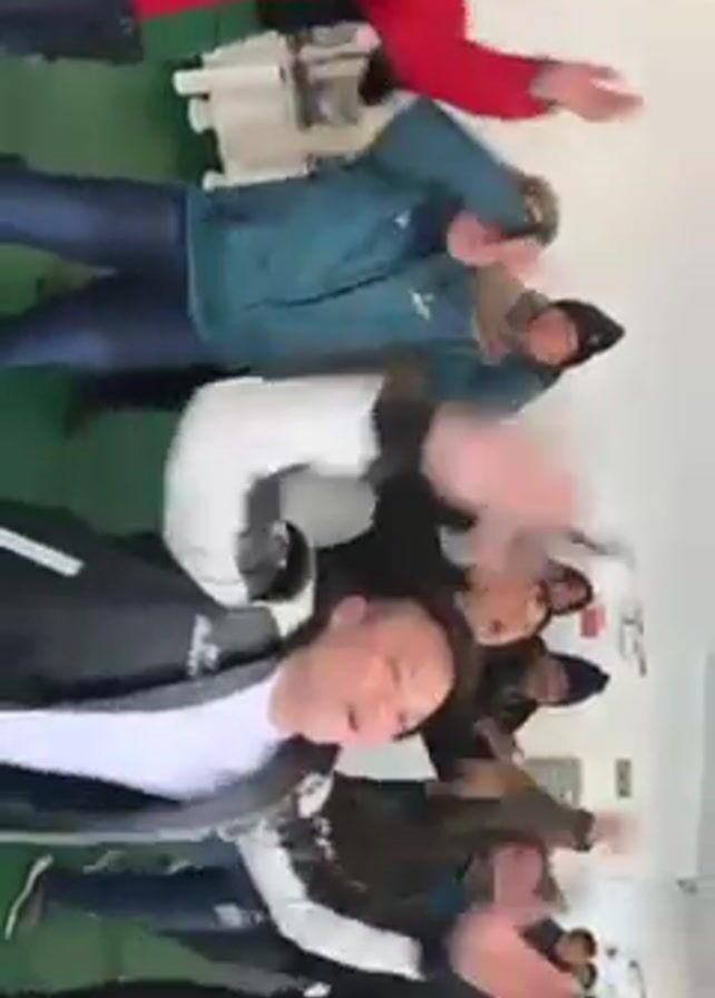 A group of about 15 people are dancing, apparently on a boat. They are mostly young to middle-aged, and wear jackets and jeans. They are facing the camera, which is handheld and moving. They are doing the hand motions for the song "YMCA". The boat's interior is white with dark flooring.