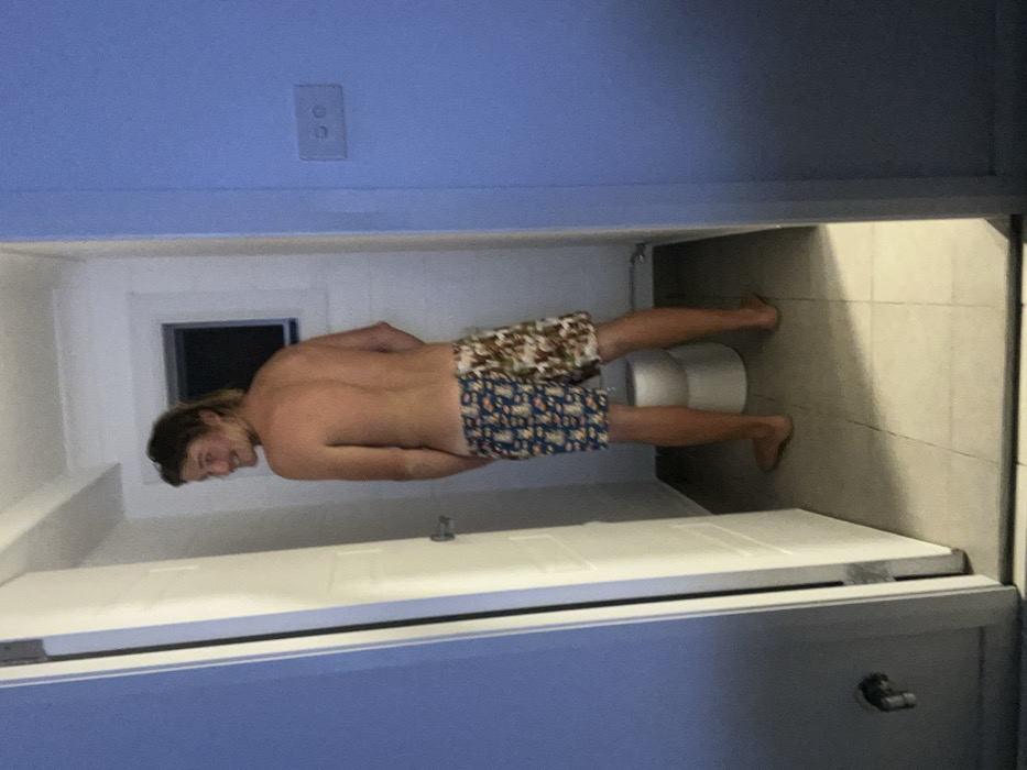 A male individual stands barefoot and shirtless within a small, tiled bathroom or toilet cubicle, observed through an open white doorway