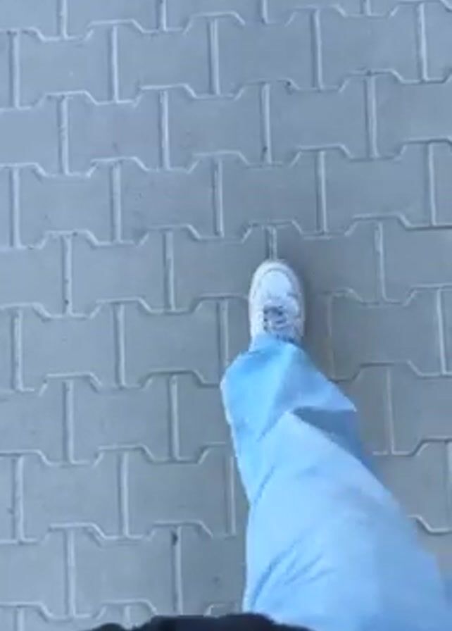 A first-person perspective video shows someone walking on a gray brick sidewalk