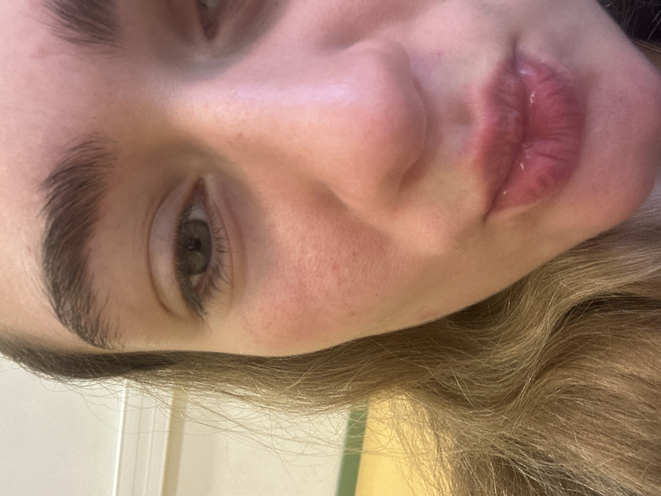 The image presents a close-up portrait of a human face, angled slightly with a shallow depth of field. The subject, appearing to be a young adult female, has light brown hair visible on the left side of the frame. The left eye, with a gray-green iris, is open, while the right eye is largely cropped, with only a portion of the outer corner and eyebrow visible. Prominent dark brown eyebrows are present. The nose is centrally positioned, and the lips are pursed forward in a puckered expression, indicative of an action such as blowing a kiss. The skin is fair, exhibiting mild, diffuse redness on the cheeks and the bridge of the nose. The background is significantly blurred, displaying indistinct areas of white, a horizontal green stripe, and yellow, consistent with an indoor environment. No visual information within the image identifies its location as Paris, France.