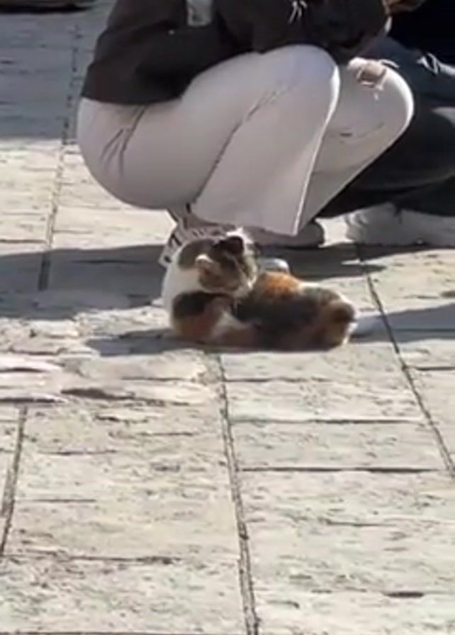 A calico cat curls up on a gray brick pathway as two people squat nearby. One person wears white pants, a brown jacket, and white sneakers. The other person wears dark pants and white sneakers. The cat lies in the sunlight, near the shoes of the person in the white pants. The people appear to be focused on something out of view.