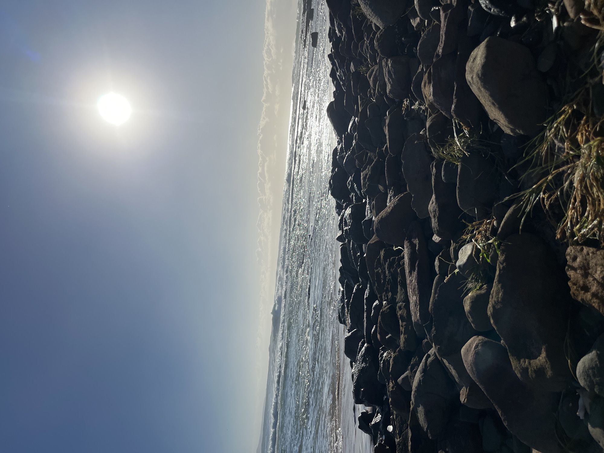 shoreline in Bulli, Australia, featuring a rocky outcrop bordering the sea. The sun shines brightly in a clear sky. Waves gently roll onto the shore, reflecting sunlight. Vegetation grows amongst the rocks. No people are visible.