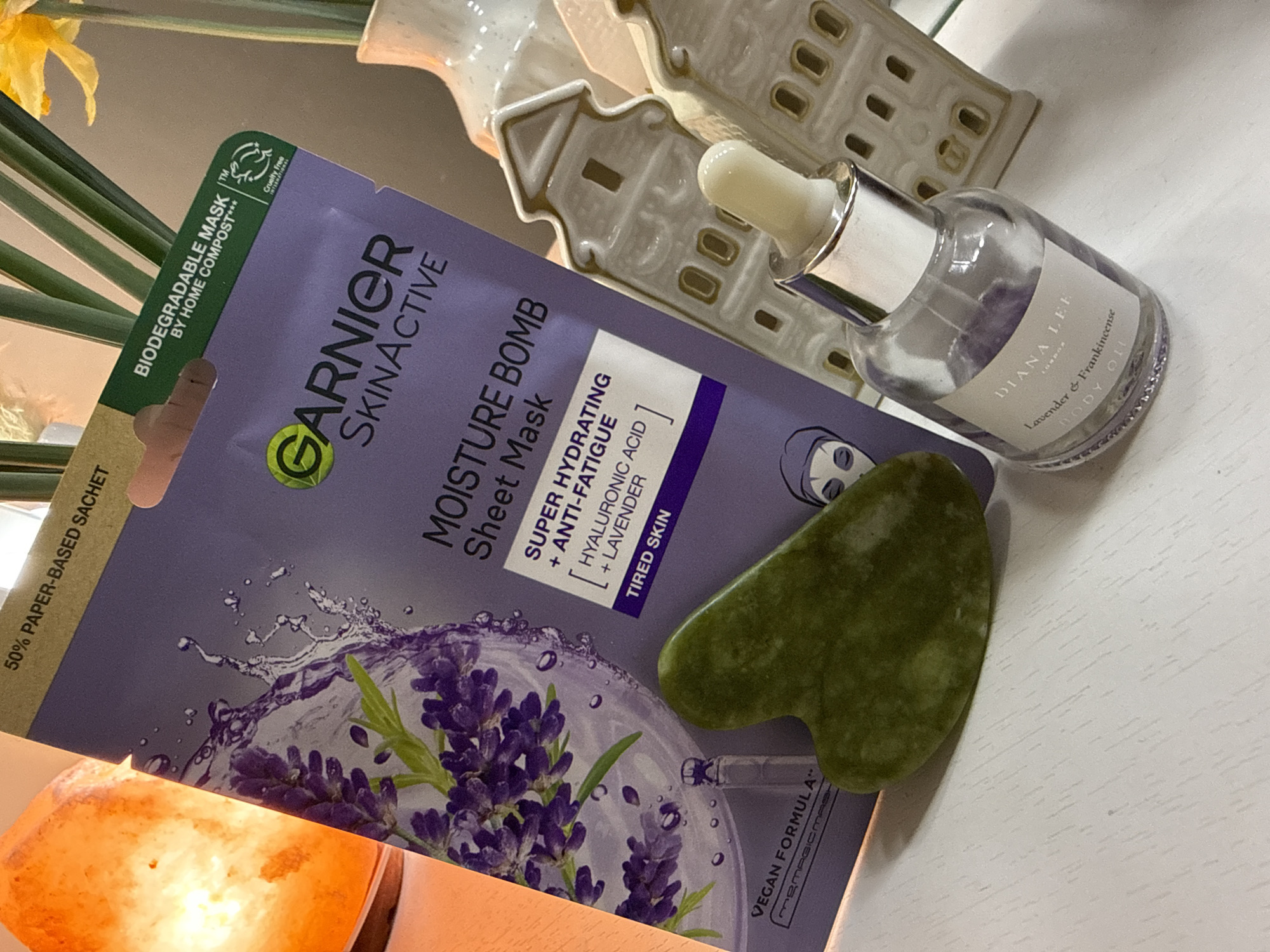 still life arrangement of skincare products on a white surface. Featured items include: * A Garnier SkinActive Moisture Bomb Sheet Mask, indicating it is super hydrating and anti-fatigue with hyaluronic acid and lavender. * A bottle of Diana Lee London Lavender & Frankincense Body Oil. * A green gua sha tool. * Two small decorative ceramic houses. * A salt lamp, glowing with orange light. * Stems of daffodils in the background. The composition suggests a focus on self-care and skincare routines. There is no indication of a specific location within Great Yarmouth, United Kingdom.
