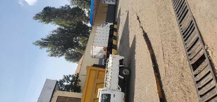 The image depicts an outdoor scene in Oloolua ward, Kenya, characterized by commercial vehicles and infrastructure under a clear, bright blue sky with minimal cloud cover. In the immediate foreground, a metal drainage grate runs horizontally over a patch of light brown dirt and gravel. This dirt transitions to a paved surface composed of interlocking blocks or cobblestones, which exhibits minor cracks and irregularities. From left to right across the mid-ground, three primary vehicles are visible: 1. A white flatbed pickup truck, possibly a Nissan, with a portion of its cab and a metal-barred bed, is positioned facing right. Its front passenger wheel is visible. 2. Behind and to the left of the pickup, a large yellow dump truck's raised bed is partially visible. 3. Further right, a white box truck with red and white striped reflective markings on its rear is stationary on the paved surface, positioned behind a black and yellow striped barrier or curb. 4. On the far right, partially obscured by the blue canopy structure above it, a section of another white vehicle is visible. In the background, a light-colored building with a flat roof and stone-textured lower facade is seen on the left. A continuous beige wall of another building stretches across the central background. Several tall, densely foliated green trees stand prominently behind the structures and vehicles, silhouetted against the sky. Shadows cast by the vehicles and structures indicate direct sunlight. No individuals are present in the scene, and no overt actions or interactions are occurring.